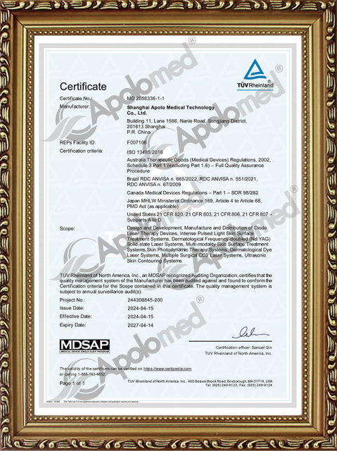 Shanghai Apolo Medical Technology Co., Ltd est l'un des principaux concepteurs et fabricants de lumière pulsée intense (IPL), de diverses technologies laser (Pico Nd: YAG, CO2 ......), de laser à plate-forme, de HIFU, de LED PDT et de technologies d'amincissement du corps destinées aux industries médicales et esthétiques.